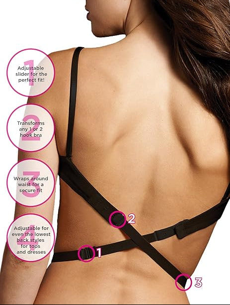 Skip the elusive search for the perfect low-back bra and just convert your bra so you can wear tops and dresses with a low back. Simply attach the hook and eye of your bra to the converter, bring the strap around your waist and close in front.