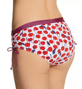 Anita's Sweet Venice Ebru Swim Bottom boasts a charming cherry print and a playful striped waistband. The side tie swim bottom has mid-rise styling and offers moderate, "cheeky" coverage in the back. Made of polyamide and elastane.